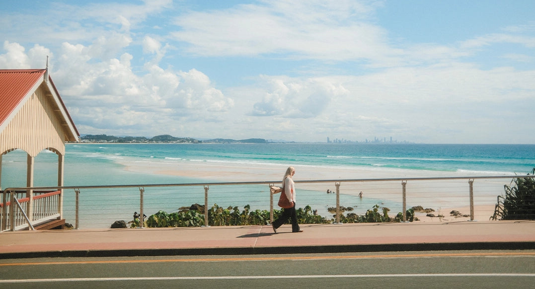 Rainbow Bay adjoins one of the most famous surf breaks in the world: Snapper Rocks. On a good swell, it links into the legendary Superbank, serving up one of the best right-hand point breaks you’ll ever see. For Laura, it’s both playground and inspiration — the kind of place you can paddle out for hours or simply perch at the Rainbow Bay Surf Life Saving Club balcony and watch the waves peel down the line.